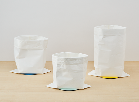 薄手の紙の袋に厚手の紙の底板を組み合わせることにより重心が安定する新しい形の紙器です。