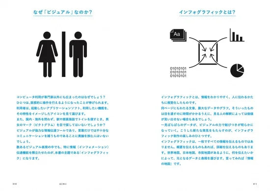 Webサイト「VISUALTHINKING」の運営者による、情報をわかりやすく視覚的に伝えるためのエッセンスをまとめた、ウェブ時代のインフォグラフィック制作入門書。インフォグラフィックとは、分解すると【ピクトグラム×図解】であると捉え、まずは基礎体力づくりとして前半でそのそれぞれの描き方を、そして後半でインフォグラフィックの作り方を一歩ずつ習得するという構成にしています。「自分の伝えたいことをビジュアルでわかりやすく他者に説明できるようになりたい」、そのようなニーズに応えることを目指しています。