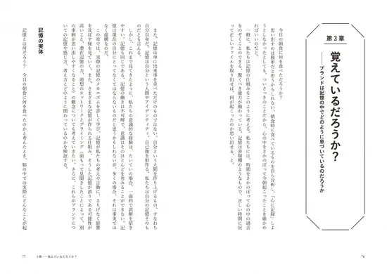 本書の第1部では「無意識」にフォーカスし、私たちの脳が持つ驚くべき働きについて説明していきます。第2部では、第1部の脳の実際の働きをふまえて、著者の提案する考え方である、「ブランド・ファンタジー」を用いて、ブランドとは一体何なのか、人の心の中でどのように存在しているのか、どのように育て形作ればいいのか、という点を紐解きます。第3部では、第2部で得た考え方をブランド構築や広告、市場調査、商品イノベーションに応用して解説し、脳の実際の働きにマッチしたブランド構築法を提案する内容となります。